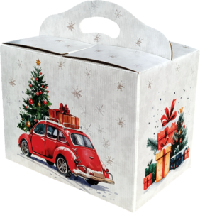 Oryginalne pudełko 290x190x220 GARBUSEK z uchwytem – stylowe opakowanie prezentów z nadrukiem autka. Trwałe, estetyczne i łatwe w składaniu.