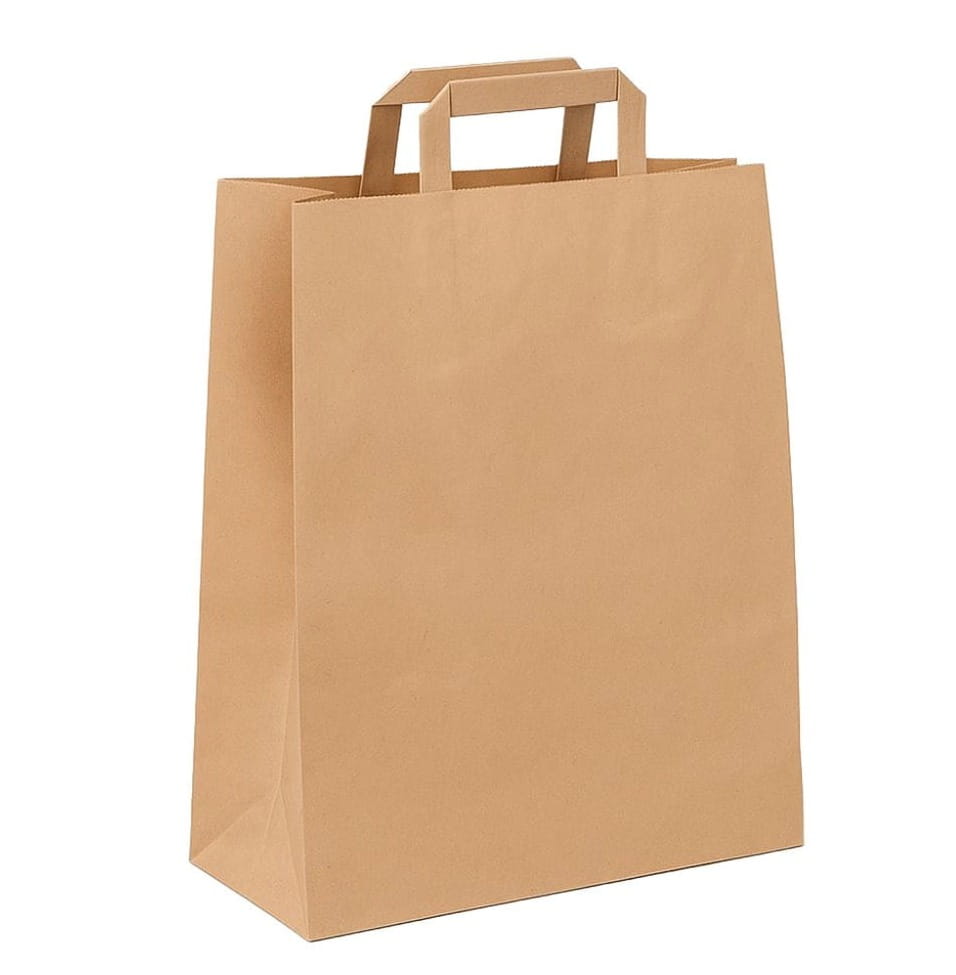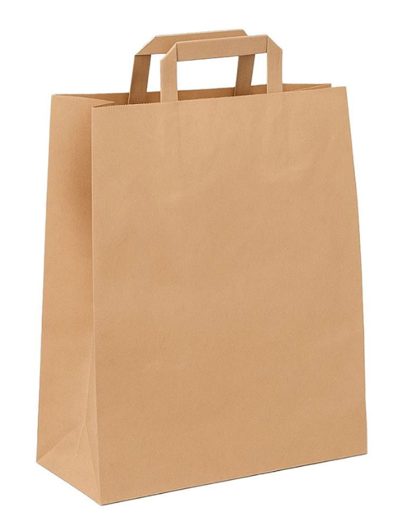 Brązowa torba papierowa 32x16x43 cm z płaskim uchwytem – trwała, ekologiczna i wygodna. Idealna do zakupów, pakowania prezentów i materiałów promocyjnych.