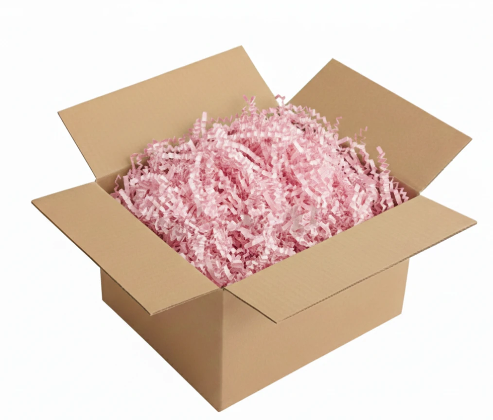 Różowy pudrowy wypełniacz papierowy SizzlePak – 1 kg. Ekologiczny i dekoracyjny wypełniacz do pakowania delikatnych produktów i prezentów.